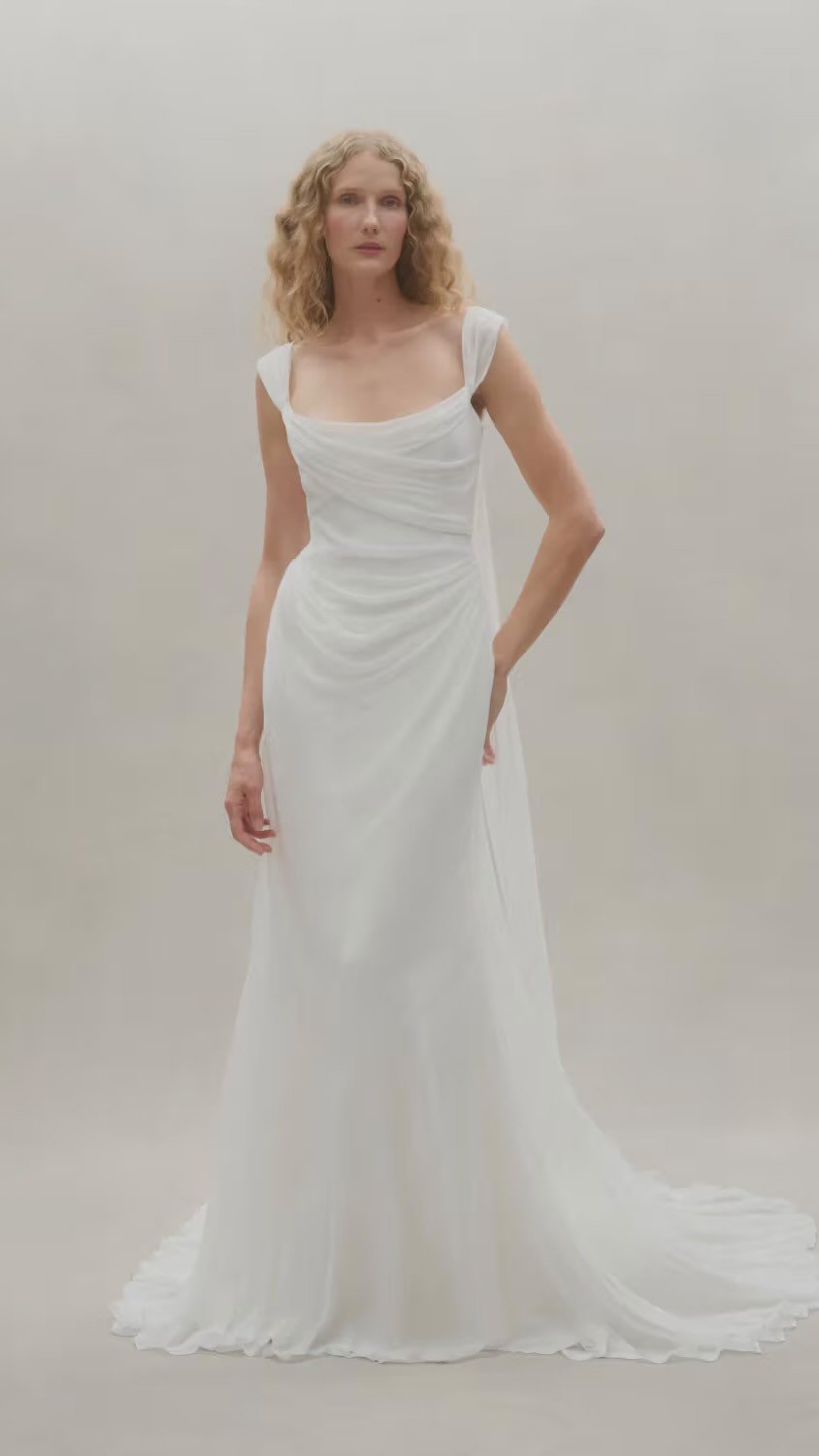 Another way to put a creative spin on wedding traditions is by wearing a light pink wedding dress. For this shoot, Katherine Tash’s ‘Luna’ dress in Rose made a striking appearance. The gown’s lightweight liquid organza fabric shimmered in the natural light, creating an airy and enchanting appearance in this sunlit warehouse. Made up of a structured bodice that elegantly drapes and creates a layered, tulip-like look, Luna by Katherine Tash was meant to be worn at a pink garden wedding.