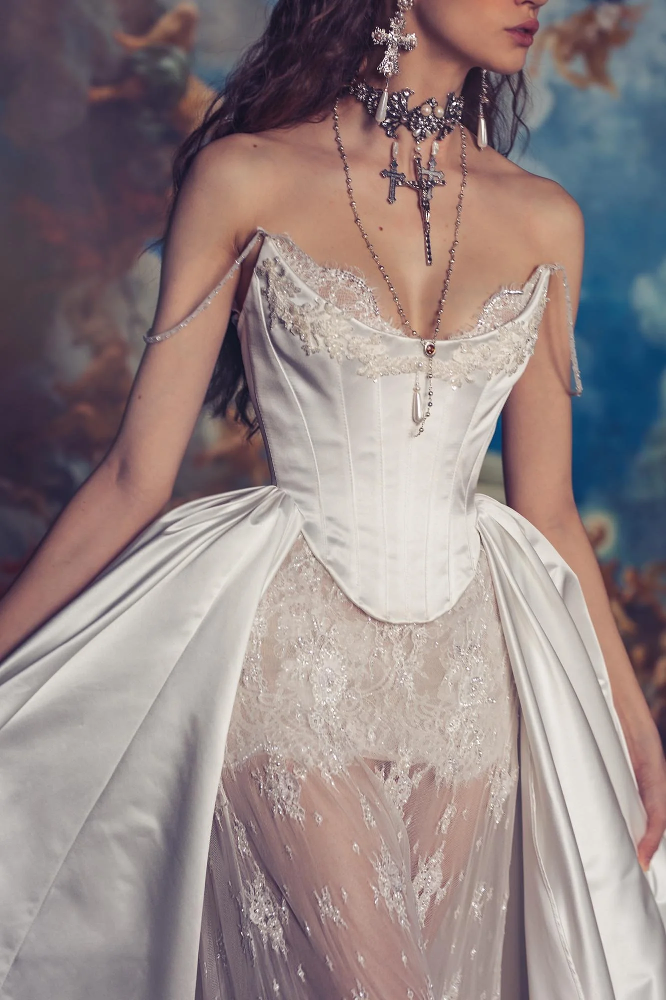 Kim Kassas wedding dresses are defined by a couture-forward aesthetic that blends structure, romance, and bold femininity. Each design is rooted in architectural corsetry and sculpted silhouettes, creating gowns that feel powerful, intentional, and undeniably fashion-driven.